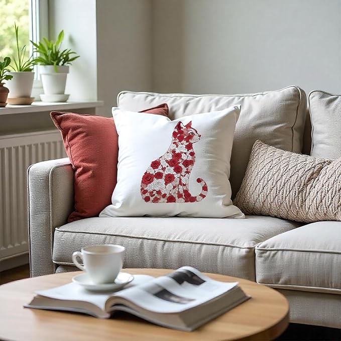 Red and White Rose Floral Cat Pillow Covers 18x18, Gifts for Cat Lovers Mom Lady Owners, Elegant Kitten Kitty Decorative Pillow Covers for Home Bedroom Living Room Decor, Pet Lover Gifts