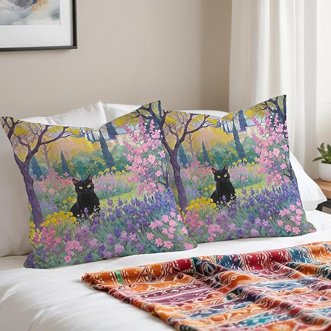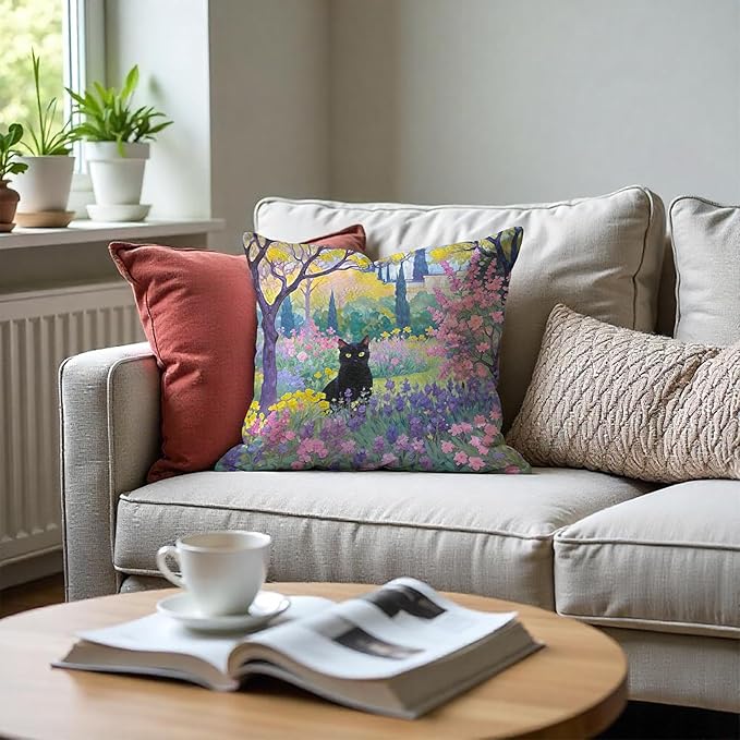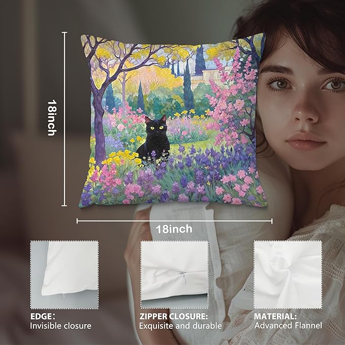 Spring Garden Black Cat Pillow Covers 18x18, Cats Lovers Lady Gifts, Cat Mom Grandma Gifts, Vintage Floral Cats Decorative Pillow Covers for Home Bedroom Living Room Office Decor