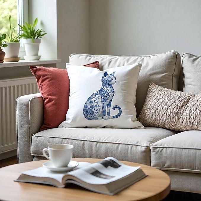 Blue and White Chinoiserie Floral Pillow Covers 18x18, Gifts for Cat Lovers Mom Lady Owners, Elegant Kitten Kitty Decorative Pillow Covers for Home Bedroom Living Room Decor, Pet Lover Gifts