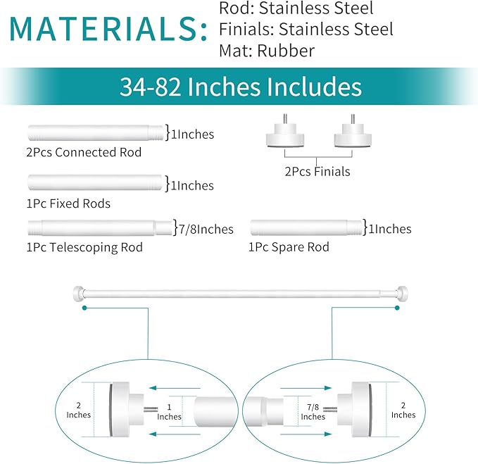 - Package Contents: The package you receive includes a total of 5 rods, 1 fixed rod,1 spare rod,1 telescopic rod,2 connected rods and 2 finials