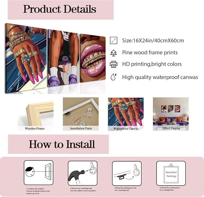 - 【Ready to Hang】 Each canvas measures 16x24 inch and comes professionally stretched and framed, ready to hang. Whether girly room decor or aesthetic home decor, black women of wall prints create a chic and empowering
