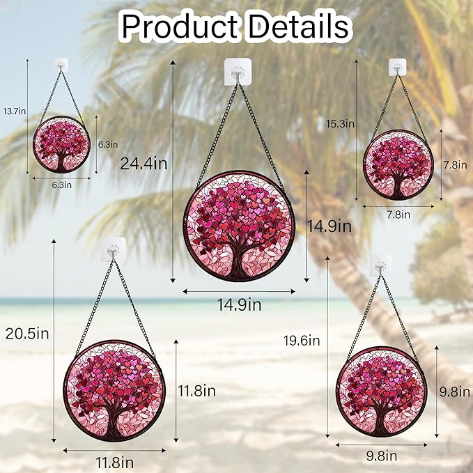 Stained Glass Window Hanging, Pink Love Tree of Life Sun Catchers Colorful Glass Panel Suncatcher Decor for Birthday for Women, Men, Wife, Lovers, and Mom 14.9x14.9 in