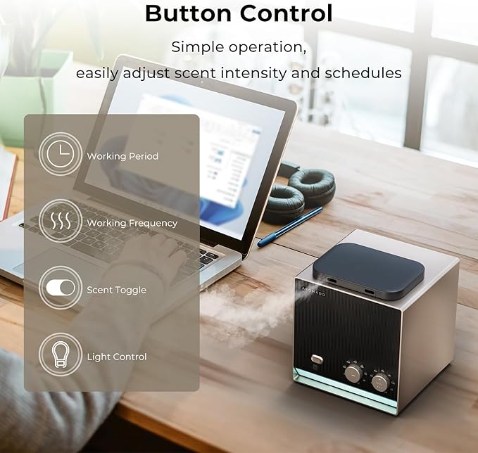 - EASY CONTROL FOR YOUR PERFECT AROMA – Adjust your working time and intensity effortlessly with intuitive button controls. For ultimate convenience, customize schedules and settings remotely via the Aromadd APP, available for both iOS and Android. (Note: Functions like nozzle switching and light adjustments are controlled via the buttons.)