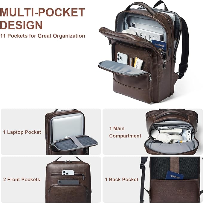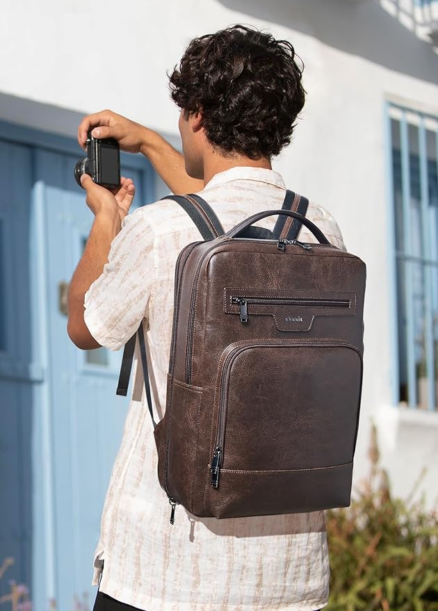 Shrrie Leather Laptop Backpack for Women and Men,28 L Travel Backpack Computer Bag Fits 16 inch Laptop,Expandable Casual Daypack with USB Charging Port for Work Business Weekender College,Coffee