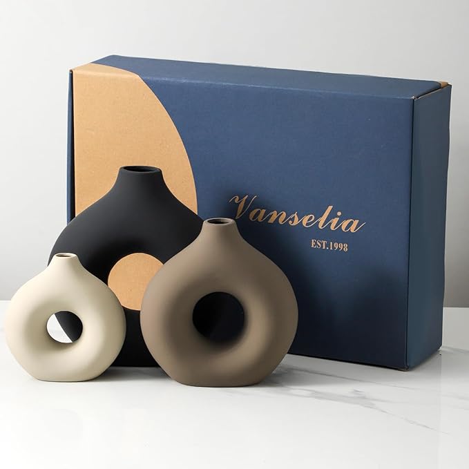 - 【Artful & Playful Decor】Bring charm and creativity into your home with our donut-shaped ceramic vases — a perfect blend of style and functionality. Their unique hollow design adds a modern touch, making them ideal for enhancing your dining table, living room, or office. Whether showcasing fresh flowers, dried arrangements, or standing alone as decorative pieces, these versatile vases effortlessly elevate any space with their artistic appeal.