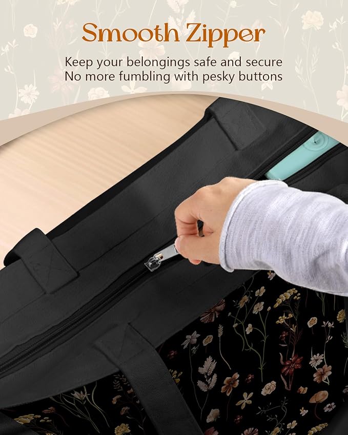 Canvas Tote Bag for Women – Aesthetic Canvas Bag with Zipper Cute Stylish Reusable Shoulder Totes for Shopping Work Daily Vacation, Black Grow Flower