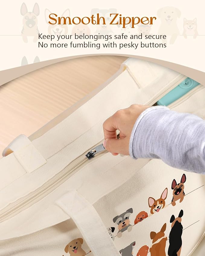Canvas Tote Bag for Women – Aesthetic Canvas Bag with Zipper Cute Stylish Reusable Shoulder Totes for Shopping Work Daily Vacation, Multi Puppies