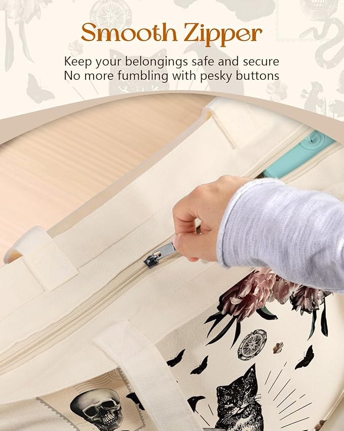 Canvas Tote Bag for Women – Aesthetic Canvas Bag with Zipper Cute Stylish Reusable Shoulder Totes for Shopping Work Daily Vacation, Crow Cat