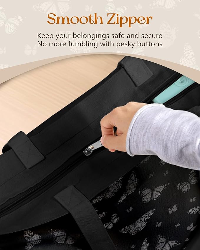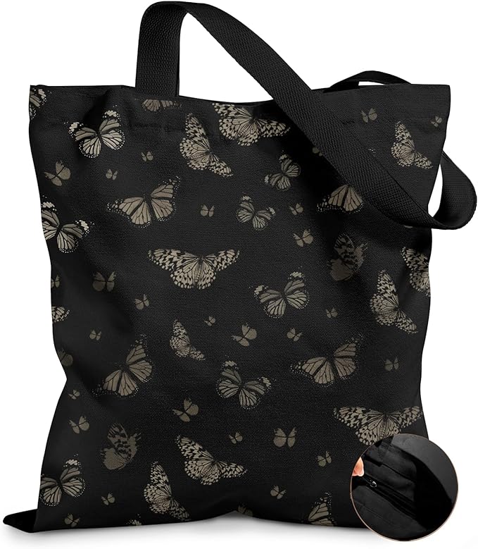Canvas Tote Bag for Women – Aesthetic Canvas Bag with Zipper Cute Stylish Reusable Shoulder Totes for Shopping Work Daily Vacation, Black Butterfly