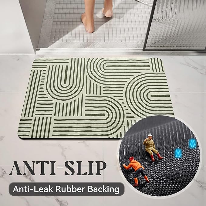MontVoo -Bath Mat-Non Slip Thin Bathroom Rugs Fit Under Door- Quick Dry Absorbent Faux Suede Surface Grey Bathroom Floor Mats-Shower Rug for in Front of Bathtub Shower Ivory & Green Arched 17x27.5