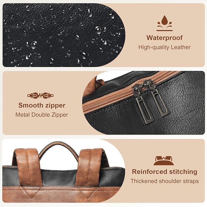 - 【Leather Laptop Backpack for Women】:Laptop backpacks made of soft and durable faux leather and fabric lining,thick shoulder straps,unique leather handles,no-slip zippers.The heavy-duty laptop backpack women features a total of 2 compartments and 11 pockets,making it easy to organize all work necessities,college supplies,and travel essentials,with dimensions of 16.5" x 15.7" x 7.8" and a weight of 2 lbs