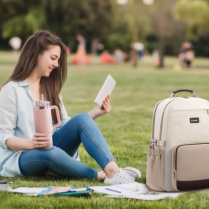 LOVEVOOK Laptop Backpack for Women with Pouch Pocket for Large Capacity Cup,18 Inch Laptop Computer Bag Travel Backpack Purse,Waterproof Work Business College Teacher Backpack,Beige-Nude-Logam Plum