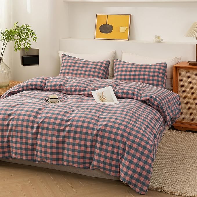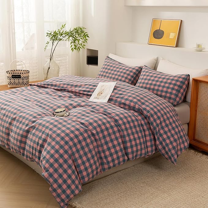 ECOCOTT Duvet Cover Set, 100% Washed Cotton Linen-Like Textured Soft & Breathable, Durable Comfy Bedding Set for All Seasons King Size, Purple Pink Plaid