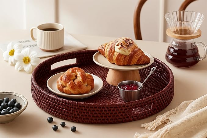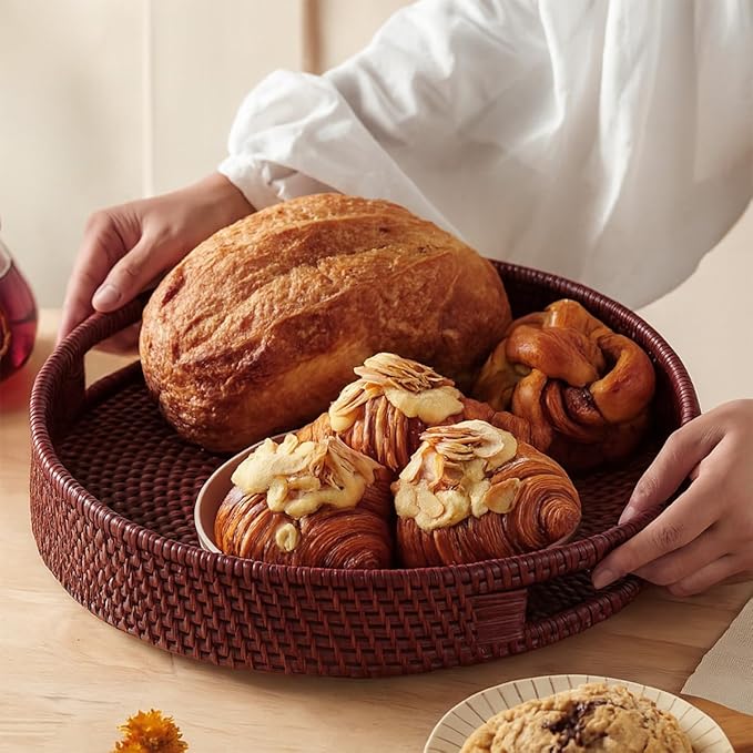 - ⭐️ VERSATILE & STYLISH: With a generous ~14-inch diameter (34.5 cm x 6.5 cm), this elegant table basket tray is perfect for serving food, coffee, desserts, or as a centerpiece to display decor. Its timeless circle design—available in chestnut brown, whitewash, or natural honey—adds a touch of natural farmhouse elegance to any home, making it a thoughtful gift for any occasion. As this is a handcrafted natural product, slight colour variations may occur.