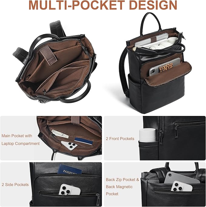 Leather Laptop Backpack for Women, Travel Backpack Purse Fits 15.6 Inch Laptop, Casual Daypack with Laptop Compartment for Teachers College Work Business Nurse Weekender, Black