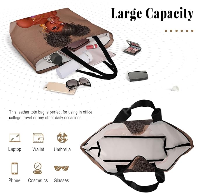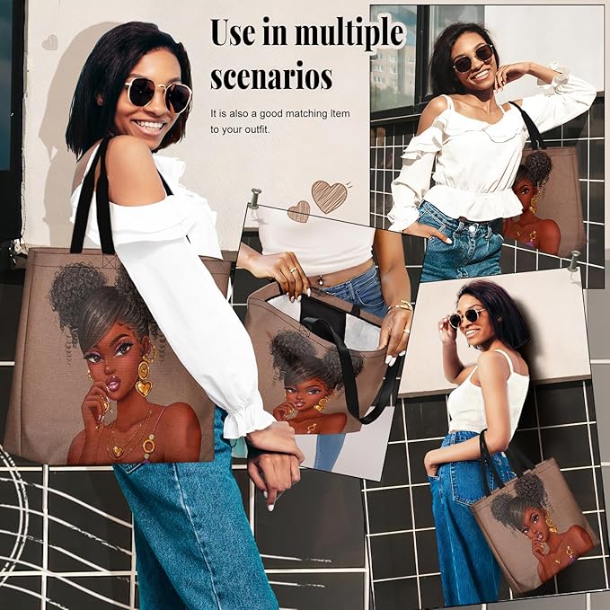 African American Women Tote Bag Black Shoulder Handbag For Women Fit Work Beach Labtops With Zip