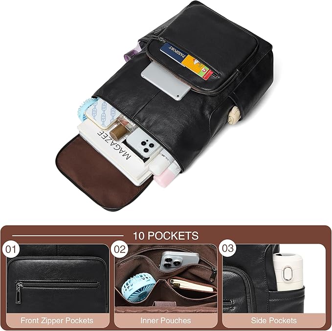 - Large Capacity Backpack:This laptop backpack women has 10 pockets for easy storage: 1 main pocket containing 1 laptop compartment with foam, 1 inner zipper pocket, 2 inner open pockets;2 outer side zipper pockets, 2 front zipper pockets and a anti theft back pocket. So you can keep your office documents, cell phone, clothes, etc. in your leather laptop backpack.
