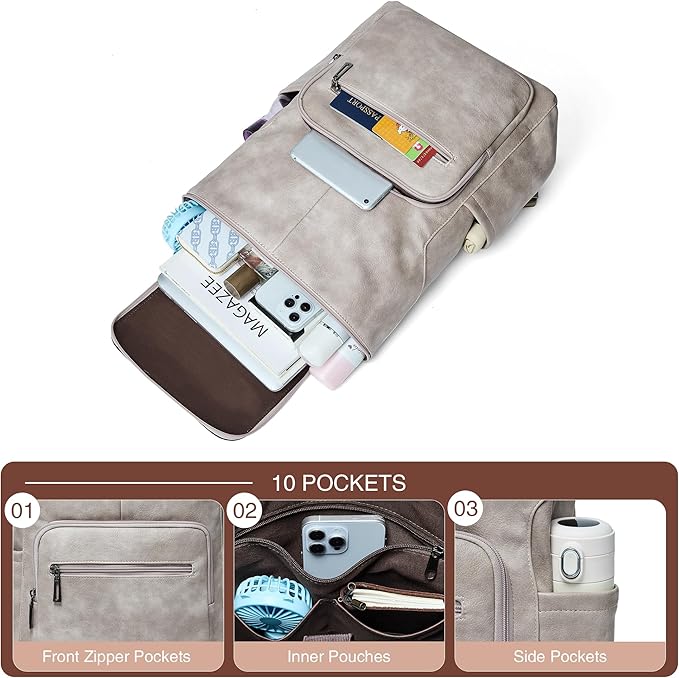 - Large Capacity Backpack:This laptop backpack women has 10 pockets for easy storage: 1 main pocket containing 1 laptop compartment with foam, 1 inner zipper pocket, 2 inner open pockets;2 outer side zipper pockets, 2 front zipper pockets and a anti theft back pocket. So you can keep your office documents, cell phone, clothes, etc. in your leather laptop backpack.