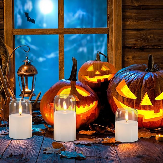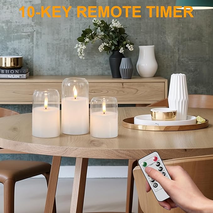 GenSwin Glass Flameless Candles with Remote Timer, Clear Battery Operated Candles with Flickering Flame, Glass and Real Wax LED Pillar Candle for Halloween Christmas Home Decor(Set of 3, D3”x4”5”6”)