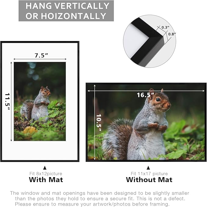 - Can Display:Each 11x17 frame includes a removable Mat (opening size: 7.5"x11.5"), fits for 8 x 12 picture print (with Mat) or 11 x 17 poster (without Mat)