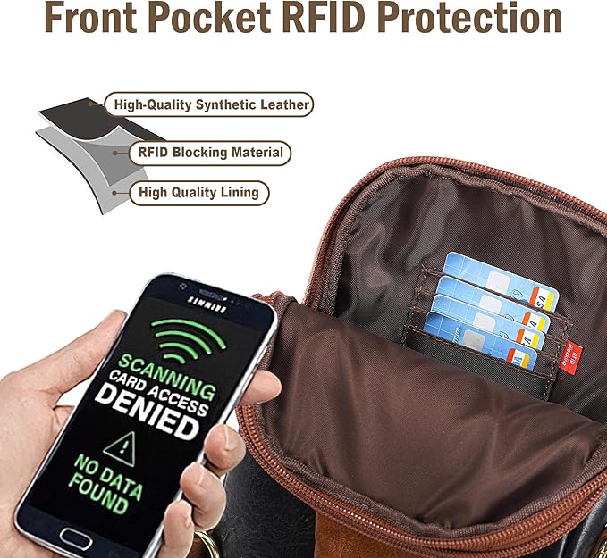 - RFID Blocking:The front zipper pocket of this rfid blocking bag has four card slots built inside, which are made of proprietary shielding materials. These card slots can effectively block RFID signals and protect your personal cards from unauthorized access
