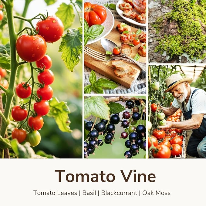 - Fresh Garden Essence - Vibrant tomato leaves and basil open with a green, earthy burst, softened by juicy blackcurrant. Fig leaves and geranium add a Mediterranean herbaceous heart, while oak moss anchors this garden-fresh scent with natural depth.