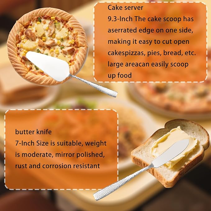 - 【5 Piece Serving Utensils Set】: Serving spoons x1 (9 inches) , slotted spoons x1 (9 inches) , serving fork x1 (9 inches) , cake server x1 (9.3 inches) , butter knife x1 (7 inches) .