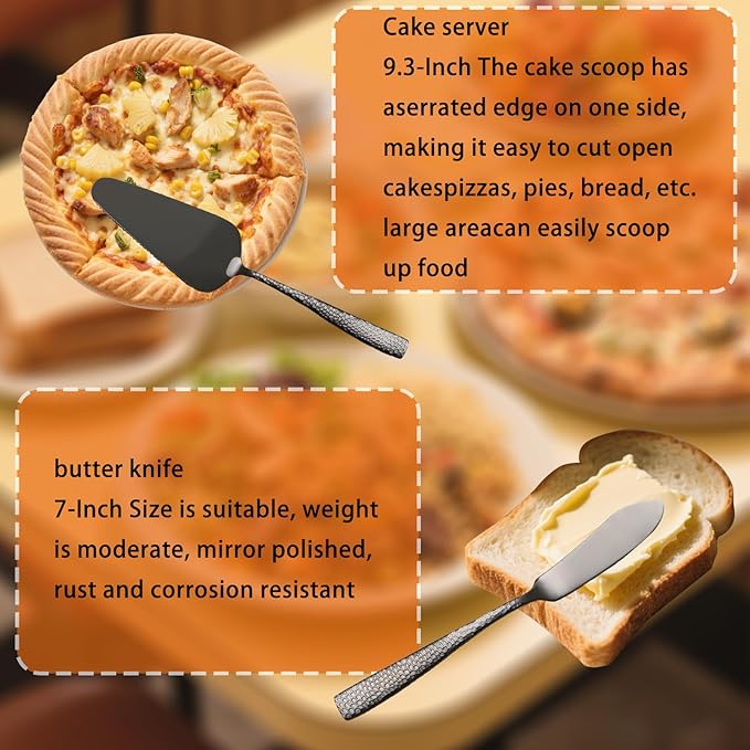 - 【5 Piece Serving Utensils Set】: Serving spoons x1 (9 inches) , slotted spoons x1 (9 inches) , serving fork x1 (9 inches) , cake server x1 (9.3 inches) , butter knife x1 (7 inches) .