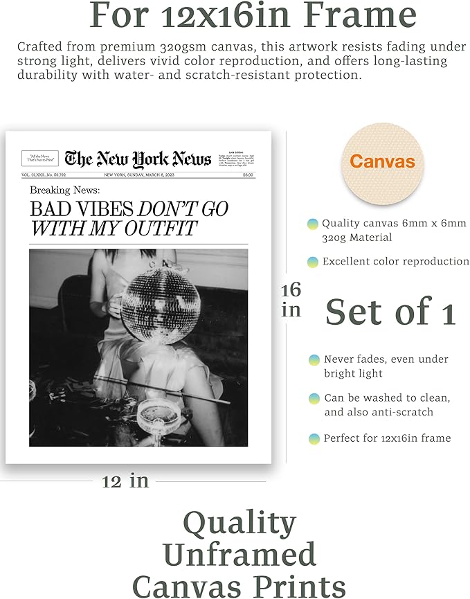 EcoHest Unframed Trendy Newspaper Magazine Wall Art, 12x16 in Bad Vibes Don't Go With My Outfit Disco Bar Canvas Wall Art, Preppy Retro Home Decor For Bedroom Living Room 1Pack