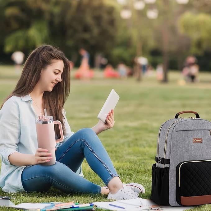 LOVEVOOK Laptop Backpack for Women with Pouch Pocket for Large Capacity Cup,18 Inch Teacher Nurse College Work Travel Backpack Purse,Waterproof Laptop Computer Bags,Grey-Black-Brown+Diamond-shaped